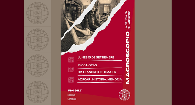 Macroscopio, ciencia y sociedad es un programa de difusión pública de la ciencia que se emite desde el año 2021 por FM UNaM, la radio de la Universidad Nacional de Misiones. En este espacio se entrevista a profesionales de diversas ramas del sistema científico: universidades públicas, CONICET, organismos de CyT. El Dr. Leandro Lichtmajer (ISES CONICET-UNT, FFyL UNT) fue invitado a participar del programa emitido el lunes 15 de septiembre para referirse a una serie de temas relacionados con la historia y política en Tucumán desde 1945 hasta la dictadura de Ongania, la industria azucarera, el cierre de ingenios en 1966 y su impacto económico y social en la provincia. Comentó también el proyecto de producción de una serie documental que recupera y preserva los acontecimientos de esos años.